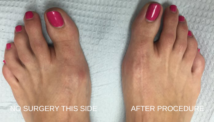 This patient had a mild bunion where only the 'bump' or prominent portion of the first metatarsal head was hurting in her high heels. Although you could consider this a cosmetic foot surgery, we consider all of our bunion (or hallux valgus) surgeries both for structural (straightening the joint and reducing the size) and cosmetic (sculpting the inside portion and keeping a natural curvature to fit in shoes) outcomes.